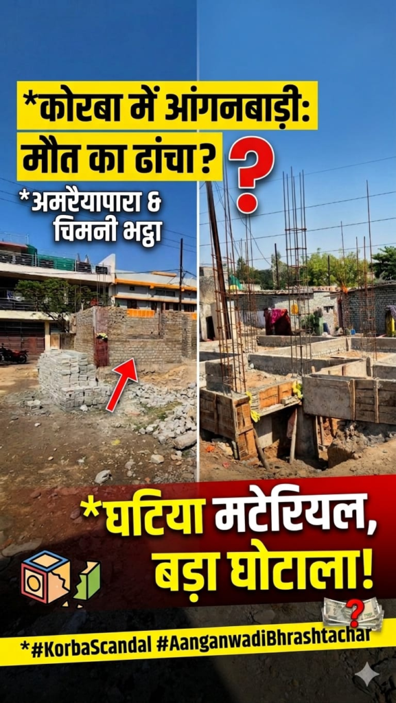कोरबा, नगर निगम क्षेत्र के वार्ड क्रमांक 14 अमरैयापारा और चिमनी भट्ठा में बन रहे आंगनबाड़ी केंद्रों का निर्माण अब बड़े घोटाले की शक्ल लेता नजर आ रहा है। जिन भवनों में मासूम बच्चों का भविष्य संवरना चाहिए, वहां भ्रष्टाचार और लापरवाही की ऐसी नींव रखी जा रही है, जो कभी भी हादसे में बदल सकती है।