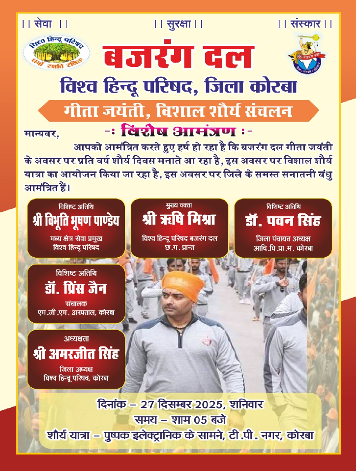 कोरबा। हिन्दू समाज की एकता, शौर्य और सांस्कृतिक चेतना को सशक्त करने के उद्देश्य से विश्व हिन्दू परिषद एवं बजरंग दल, कोरबा द्वारा दिनांक 27 दिसंबर को शौर्य संचलन का भव्य आयोजन किया जा रहा है।