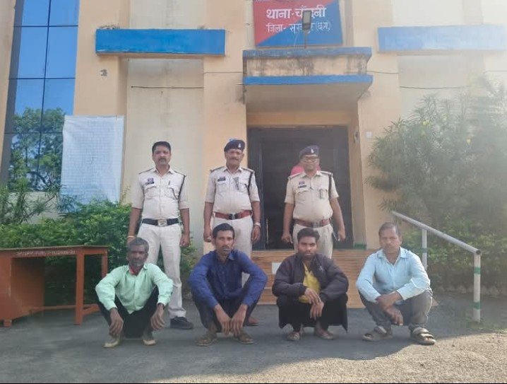 इस मामले में आरोपी अर्जुन देवागंन पिता नधीर देवागंन उम्र 35 वर्ष सा. मसनकी थाना ओडगी, मोहन उर्फ सोनू पिता नोहरसाय उम्र 29 वर्ष ग्राम सावारांवा दर्री घटिया पपडाखांड थाना ओडगी, राजेन्द्र यादव पिता स्व. शीतल प्रसाद उम्र 46 वर्ष ग्राम कर्री चौकी बलंगी थाना रघुनाथनगर जिला बलरामपुर एवं किशोरी लाल यादव पिता नानदाउ यादव उम्र 42 वर्ष सा. कर्री चौकी बलंगी थाना रघुनाथनगर को गिरफ्तार किया गया। इस कार्यवाही में थाना प्रभारी चांदनी आर.पी.साहू, एएसआई क्षेत्रपाल सिंह, प्रधान आरक्षक भूपेन्द्र सिंह पोर्ते, आरक्षक मंजीत कुमार, मंगलसाय, रूप प्रसाद राजवाड़े, मुकेश साहू व आलोक सिंह सक्रिय रहे।