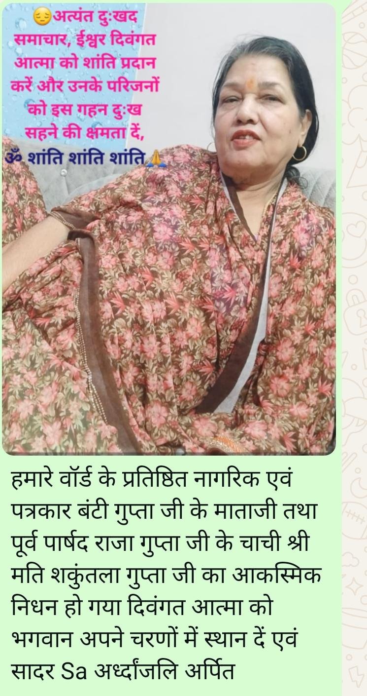 अत्यंत दुख के साथ सूचित किया जाता है कि प्रतिष्ठित नागरिक एवं पत्रकार श्री प्रमोद गुप्ता उर्फ बंटी गुप्ता जी की माताजी तथा पूर्व पार्षद राजा जी की चाची, श्रीमती शकुंतला जी का दिनांक 10 अप्रैल 2026 को आकस्मिक निधन हो गया
