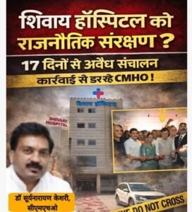 शिवाय हॉस्पिटल को राजनैतिक संरक्षण ! 17 दिन से अवैध संचालित अस्पताल पर कार्रवाई नहीं, सीएमएचओ के हाथ क्यों कांप रहे ? सत्ता का रसूख या अंदर टेबल हुई है बात ? स्वास्थ्य मंत्री ने दूरी बनाई, फिर भी लखनलाल देवांगन पहुंचे… विरोधाभास ने बढ़ाए संदेह