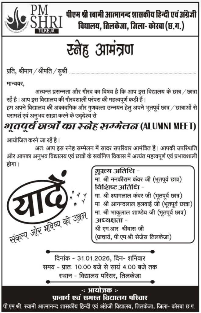 Home»CHHATTISGARH»सवा सौ साल के इतिहास में पहली बार पीएमश्री सेजेस तिलकेजा में होगा ऐतिहासिक Alumni Meet