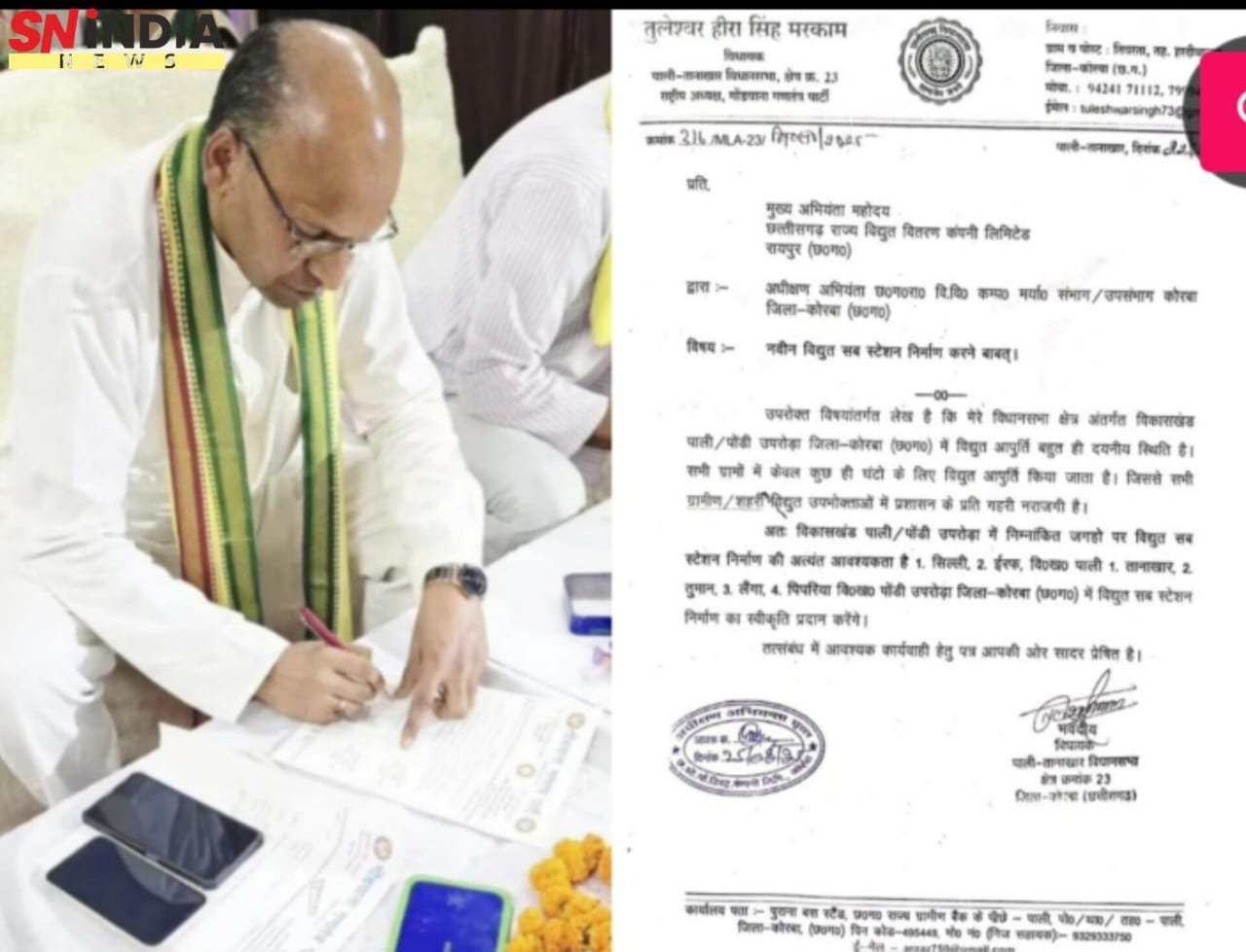 कोरबा/पाली- तानाखार:- विधानसभा क्षेत्र पाली- तानाखार के पाली एवं पोड़ी उपरोड़ा ब्लाक अंतर्गत गांवों में विद्युत आपूर्ति निरंतर बनाए रखने के लिए विधायक तुलेश्वर हीरासिंह मरकाम ने छत्तीसगढ़ राज्य विद्युत वितरण कंपनी लिमिटेड के मुख्य अभियंता के नाम कोरबा अधीक्षण अभियंता को पत्र लिख नवीन विद्युत सब स्टेशन निर्माण करने मांग की है।