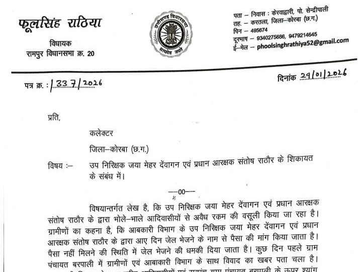 कोरबा जिले में आबकारी विभाग के दो अधिकारियों पर वनांचल क्षेत्र के आदिवासी ग्रामीणों से अवैध वसूली के गंभीर आरोप लगे हैं। रामपुर विधानसभा क्षेत्र के विधायक फूलसिंह राठिया ने इस संबंध में कलेक्टर को पत्र लिखकर निष्पक्ष जांच और दोषियों पर सख्त कार्रवाई की मांग की है।