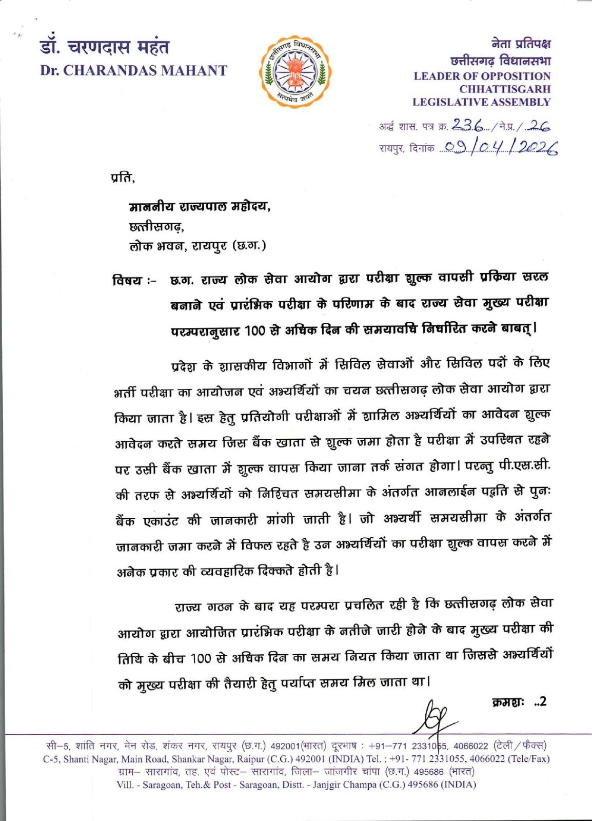 ​रायपुर 09 अप्रैल 2026 छत्तीसगढ़ विधानसभा नेता प्रतिपक्ष डॉ. चरणदास महंत ने प्रदेश के युवाओं और छत्तीसगढ़ लोक सेवा आयोग के अभ्यर्थियों के हितों को ध्यान में रखते हुए राज्यपाल एवं आयोग प्रबंधन से दो प्रमुख मांगों पर त्वरित निर्णय लेने पत्र लिखा है।