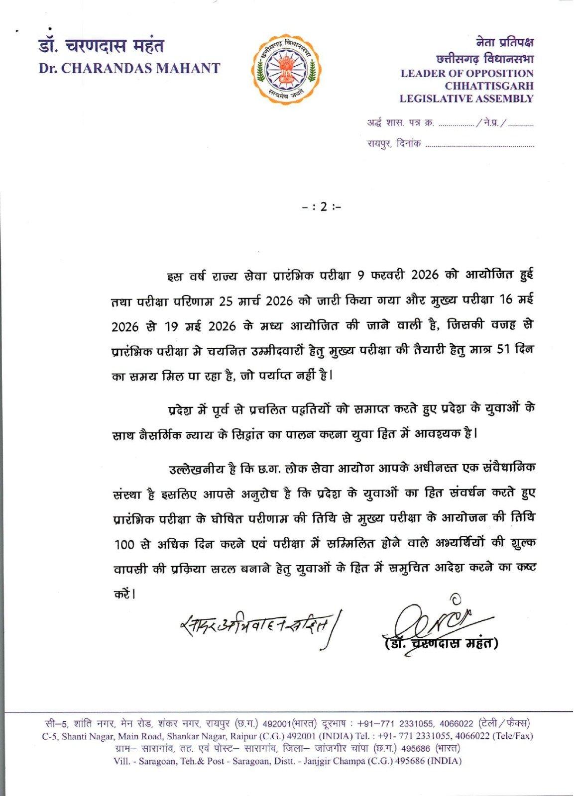 मुख्य परीक्षा की तैयारी के लिए अपर्याप्त समय और परीक्षा शुल्क वापसी की जटिल प्रक्रिया पर गहरी चिंता व्यक्त की है। ​डॉ. महंत ने कहा कि छत्तीसगढ़ राज्य गठन के बाद से ही यह स्वस्थ परंपरा रही है कि प्रारंभिक परीक्षा के परिणाम घोषित होने और मुख्य परीक्षा के आयोजन के बीच कम से कम 100 दिनों का अंतराल दिया जाता था। यह समय अभ्यर्थियों को विस्तृत पाठ्यक्रम की तैयारी और उत्तर लेखन के अभ्यास के लिए नितांत आवश्यक है। ​इस वर्ष 25 मार्च को परिणाम जारी होने के बाद मुख्य परीक्षा 16 मई से निर्धारित की गई है। अभ्यर्थियों को तैयारी के लिए मात्र 51 दिन का समय मिल रहा है, जो कि नैसर्गिक न्याय के विरुद्ध है। सरकार को युवाओं के मानसिक दबाव को समझते हुए इस समय सीमा को पूर्व की भांति 100 दिन से अधिक करना चाहिए।