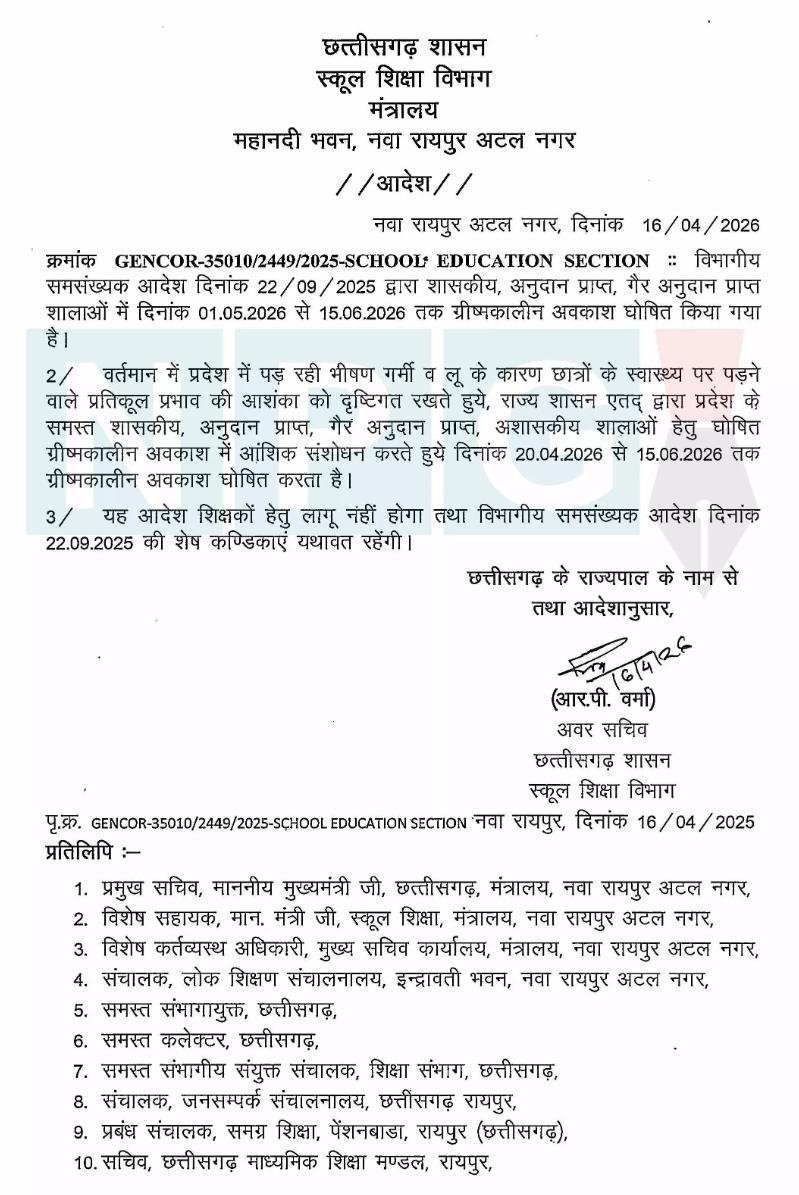 रायपुर। छत्तीसगढ़ में पड़ रही भीषण गर्मी और लू को देखते हुए स्कूल शिक्षा विभाग ने बड़ा फैसला लिया है। राज्य शासन ने ग्रीष्मकालीन अवकाश की तारीखों में संशोधन करते हुए अब 20 अप्रैल 2026 से 15 जून 2026 तक सभी स्कूलों में छुट्टियां घोषित कर दी हैं।