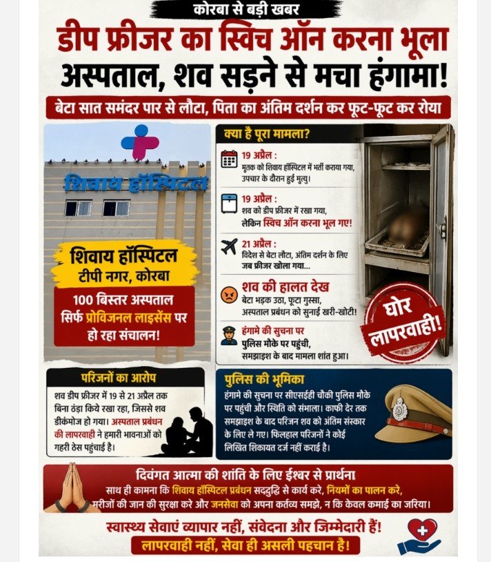 दरअसल, कोरबा शहर के निवासी एक प्रतिष्ठित परिवार के मुखिया की तबीयत बिगड़ने पर उन्हें शिवाय हॉस्पिटल टीपी नगर में भर्ती कराया गया। यहां उनकी मृत्यु हो जाने उपरांत चूंकि परिवार के सदस्य तो मौजूद थे लेकिन विदेश में रह रहे पुत्र का आना तत्काल संभव नहीं हो सकता था, इसलिए मृत देह को अस्पताल की निगरानी में ही डीप फ्रीजर में रखवाने की व्यवस्था की गई। आवश्यक औपचारिकताओं को पूरा करने के बाद मृत देह को डीप फ्रीजर में अस्पताल प्रबंधन ने रखवा तो दिया किंतु इसका स्विच ऑन करना भूल गए। 19 अप्रैल से लेकर 21 अप्रैल तक यह मृत देह डीप फ्रीजर में पड़ी रही जिसकी वजह से शव डीकंपोज होने लगा।