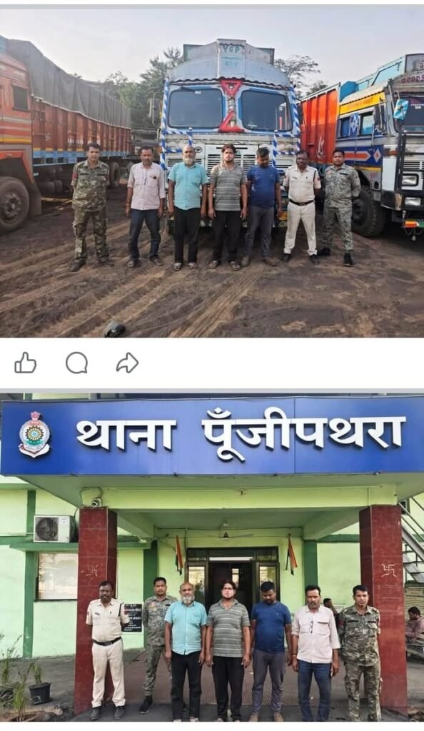 इसी क्रम में आज सुबह थाना प्रभारी पूंजीपथरा निरीक्षक रामकिंकर यादव के नेतृत्व में मुखबिर सूचना पर पुलिस टीम द्वारा तमनार चौक तथा महुआ चौक तुमीडीह में घेराबंदी कर उड़ीसा की ओर से रायगढ़ की तरफ आ रहे चार भारी वाहनों को रोका गया। जांच के दौरान तीन 12 चक्का ट्रकों में आयरन पेललेट्स तथा एक 12 चक्का ट्रक में लगभग 25 टन स्क्रैप लोहे के छड़, मशीनरी पार्ट्स आदि लोड पाया गया। वाहन चालकों से स्क्रैप एवं पेललेट्स गोली के परिवहन से संबंधित वैध दस्तावेज प्रस्तुत करने को कहा गया, किंतु दस्तावेज उपलब्ध नहीं होने पर सभी वाहनों को जब्त कर चालकों के विरुद्ध धारा 35(क), (ड) बीएनएसएस / 303(2) बीएनएस के तहत वैधानिक कार्रवाई की गई।